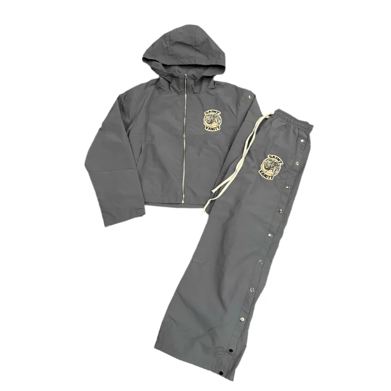 Our Grey Saint Vanity Nylon Track Set is the perfect blend of bold style and everyday comfort. Made from lightweight nylon, this set is designed for a sleek, effortless look. The cropped, hooded jacket features a zip-up front and bold graphic details, adding a statement touch.